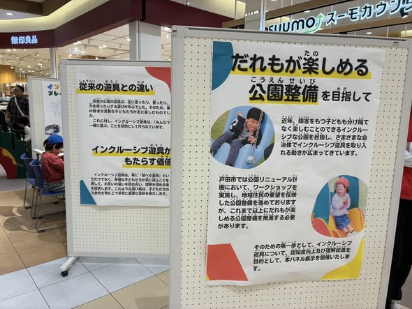 会場では、年齢や障害の有無に関わらず、誰もが一緒に楽しめるインクルーシブ遊具の展示や、考え方を紹介するパネル展示が行われています。