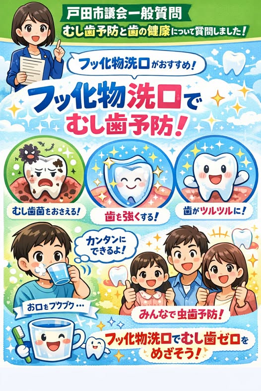 むし歯予防や歯の健康の保持は、口腔内の健康にとどまらず、糖尿病や心疾患などの生活習慣病予防にもつながる重要な取組です。とりわけ、幼少期からのフッ化物洗口は、むし歯予防に高い効果があると実証されています。市における歯の健康づくりの現状と今後の取組について伺いました。