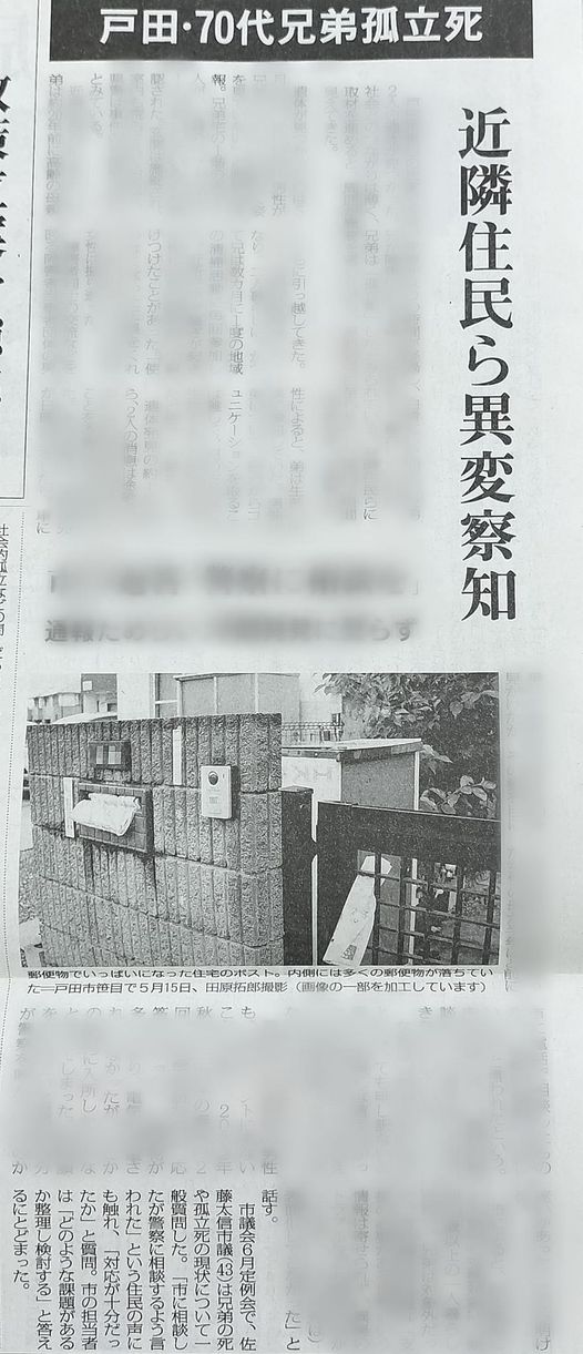 5月に兄弟が白骨遺体で発見されました。孤立死をなくす取組みについて、市議会6月定例会で一般質問した内容が19日毎日新聞に掲載されました。こうした悲劇がなくなることを願います。 #戸田市#孤立死#孤独死#戸田市議会議員#佐