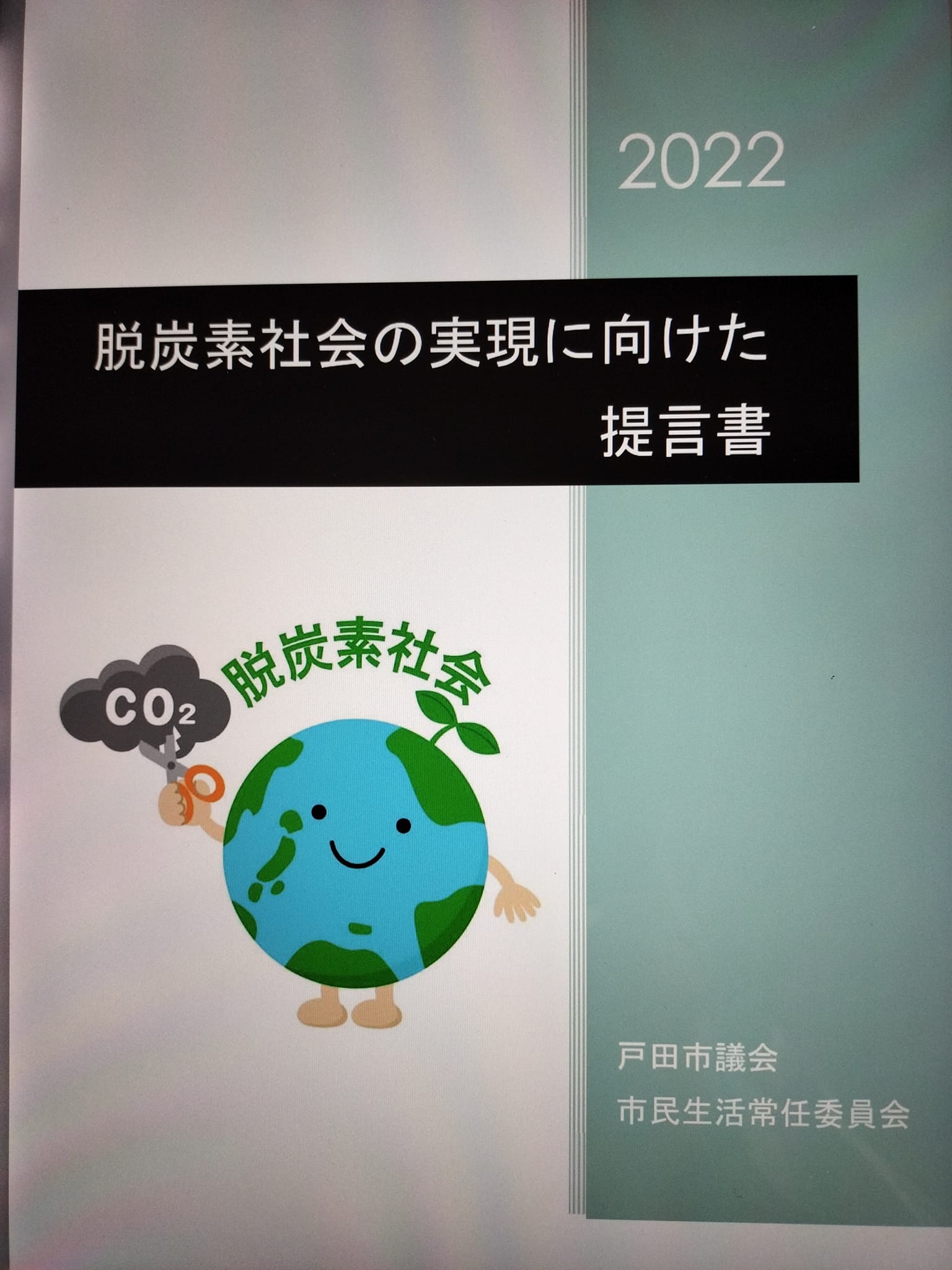 26日、市民生活常任委員会の年間活動テーマ「脱炭素社会の実現に向けて」の提言書を執行部(市担当課)に提出しました。 提言内容は以下の通りです。 (1)2050年二酸化炭素排出実質ゼロ表明を (2)ごみ減量化を (3)再生