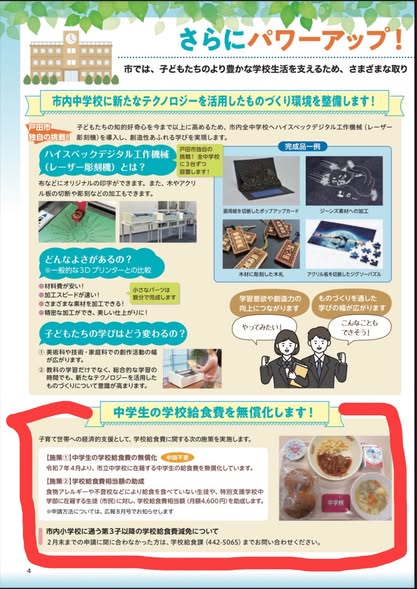 戸田市は子育て世帯への経済的支援として、中学校の学校給食費の無償化を本年4月より実施しました。また、食物アレルギーや不登校などにより給食を食べていない生徒や特別支援学校中学部に在籍する生徒に対し、学校給食費相当額(月額4