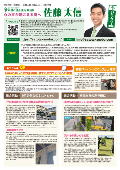 皆さまからご信託いただいた市議会議員として活動し、子どもの安全の確保、高齢者の安心の暮らし、障がい・難病者等にとって公平な社会づくりを目指してまいりました。